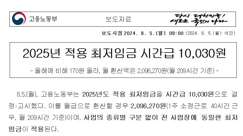 [2] 고용노동부 - 2025년 적용 최저임금 시간급 10030원