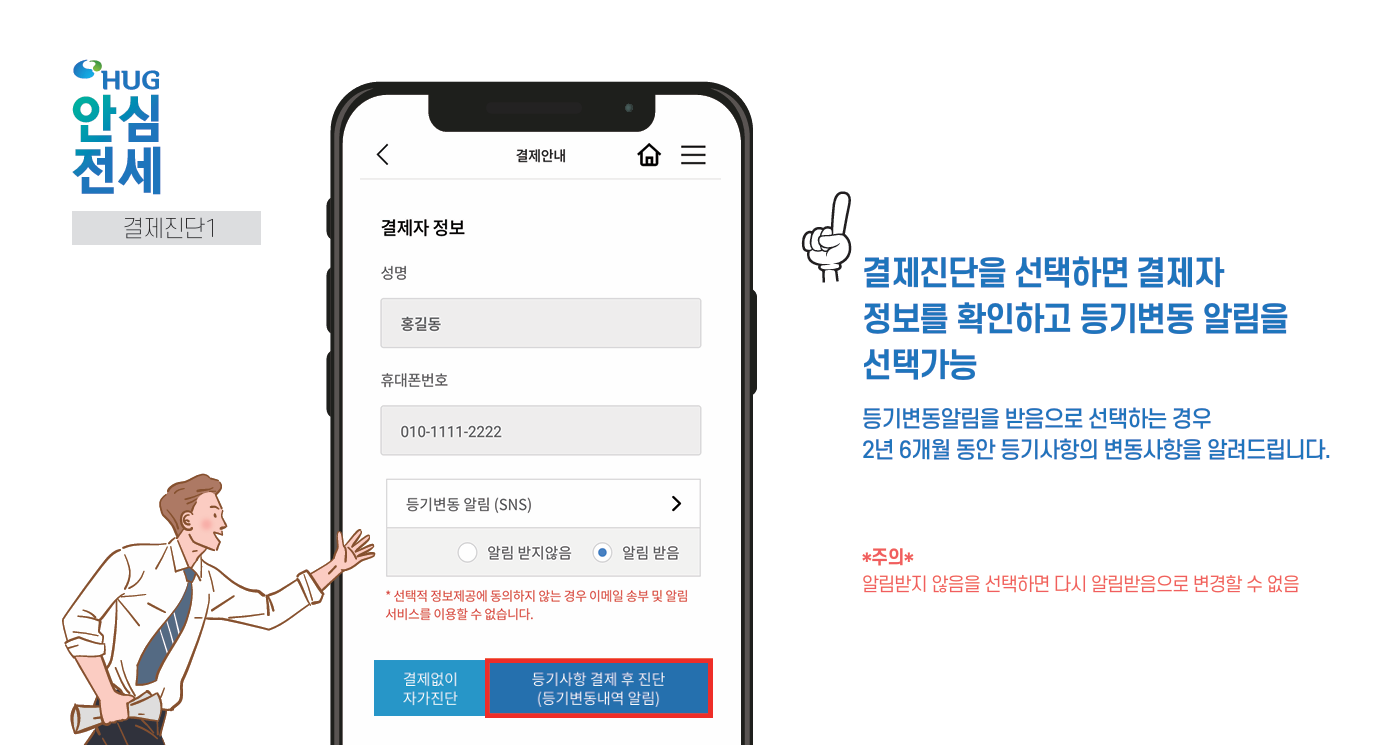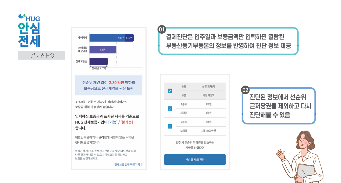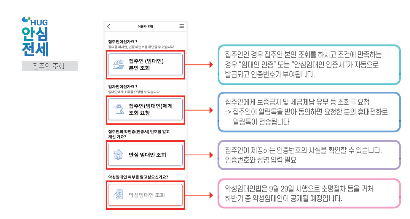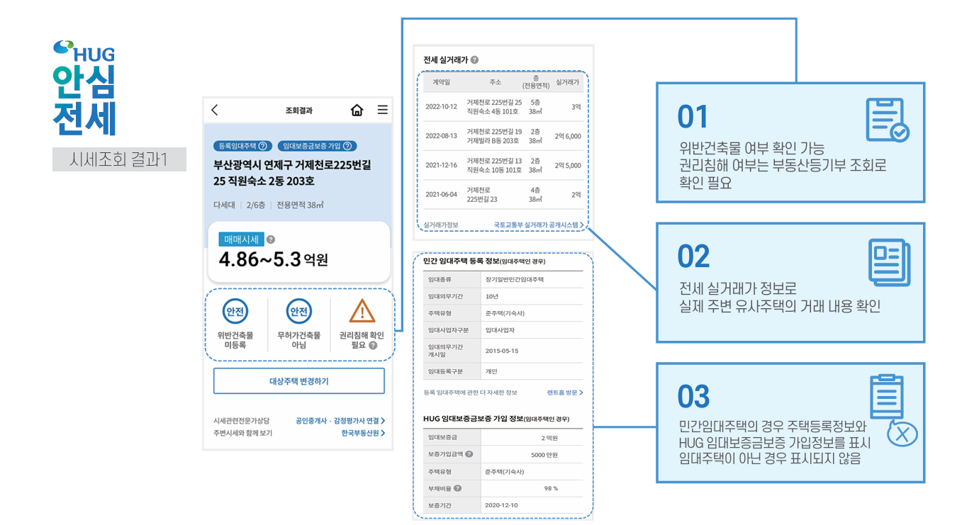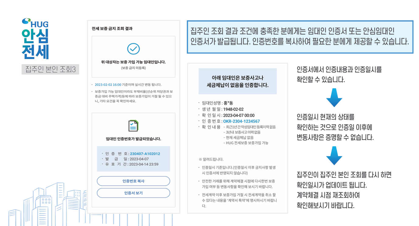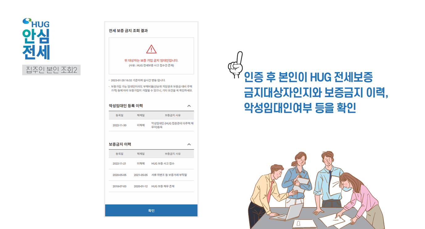 (집주인 체납사실 여부, HUG 및 HF 보증 가입 금지 여부 동시 조회, 전세보증 사고 이력 등)