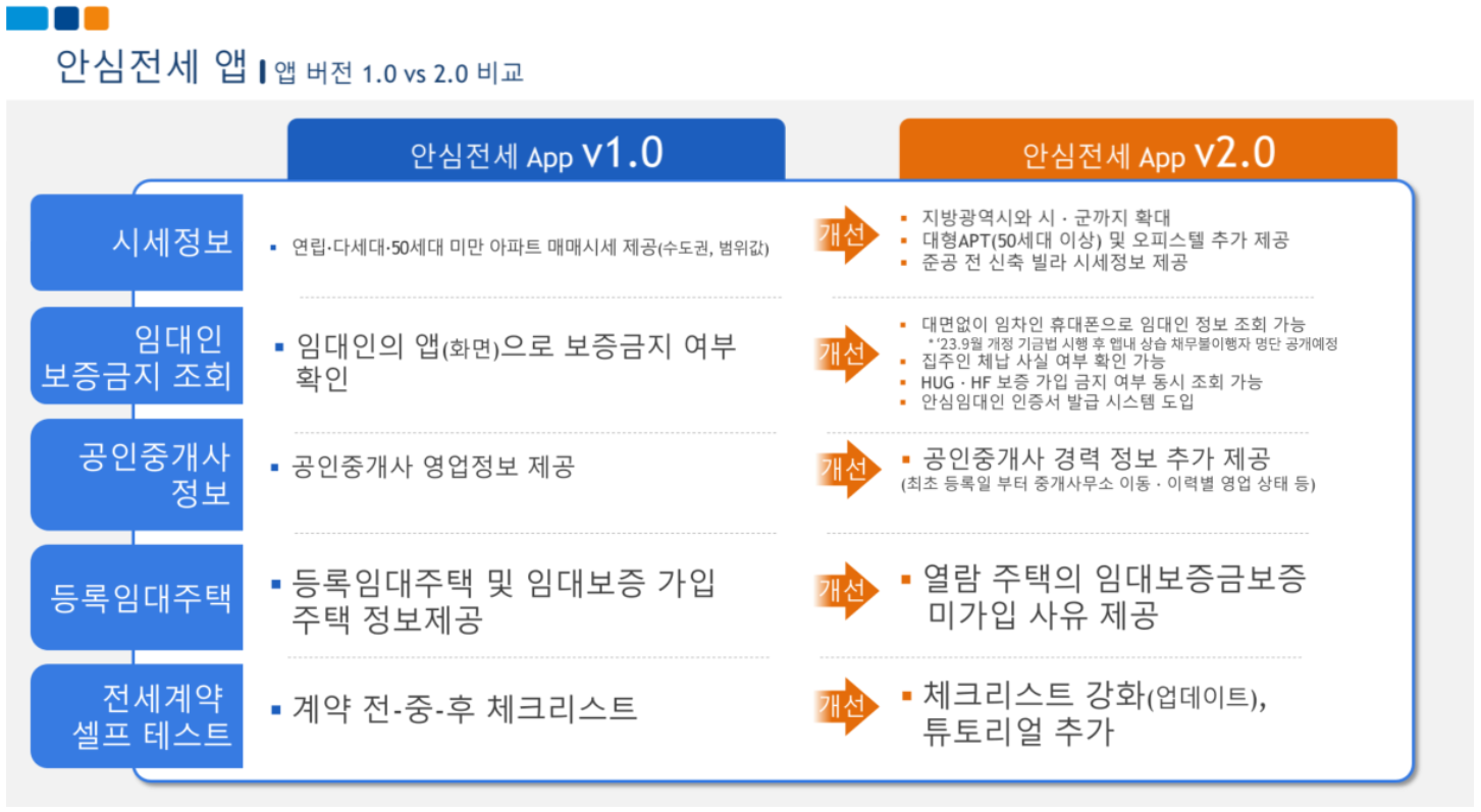 * 무료 1:1 법률상담 * 공인중개사 정보조회(경력정보 포함), 보증료 계산기 등 앱을 통해 전세보증 가입 가능 '23.5.31. 안심전세App 2.0 출시