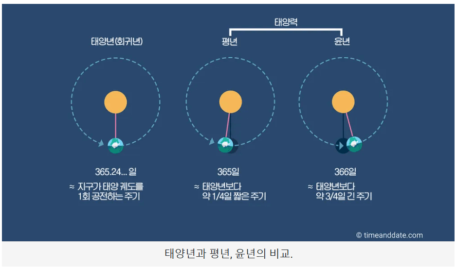 이로 인해 매년 약 0.2422일이 쌓이게 되어, 4년마다 하루를 추가하여 조정하는 것이 윤년입니다.