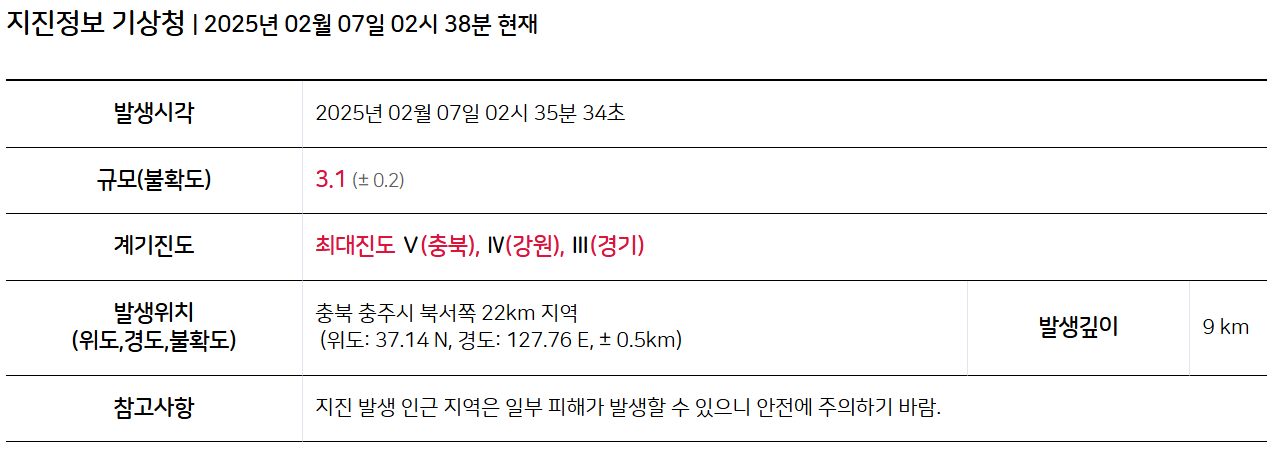 2025년 2월 7일 새벽 2시 35분, 충청북도 충주시 북서쪽 22km 지역에서 규모 3.1의 지진이 발생했습니다.