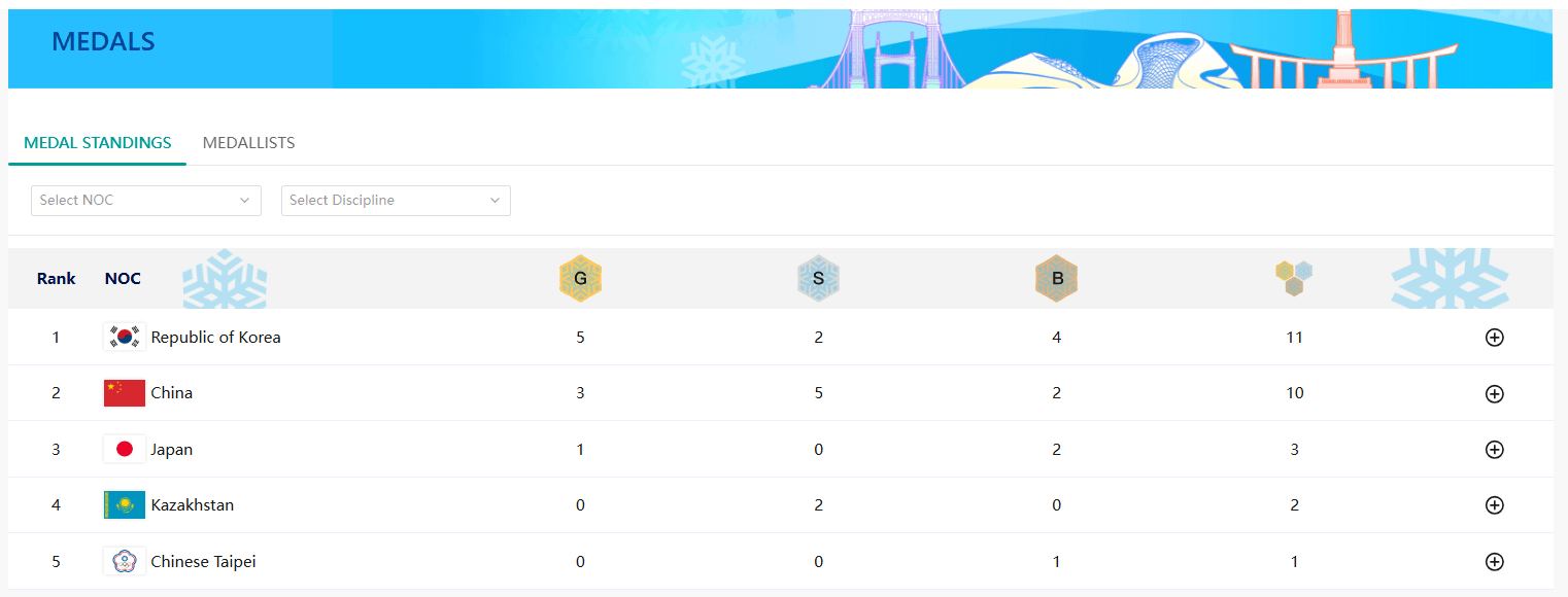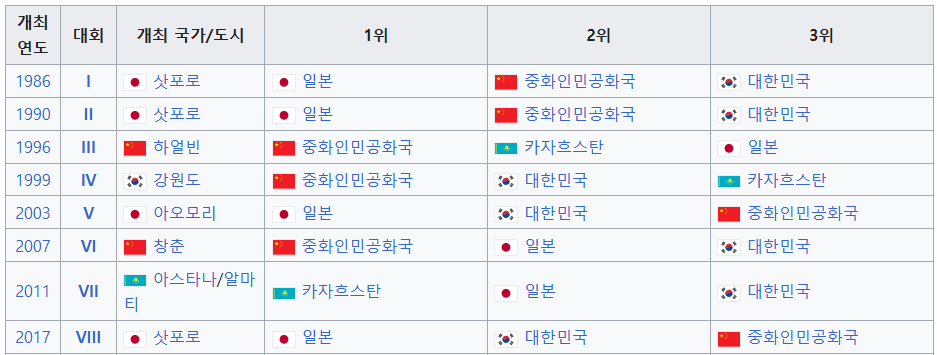 한국은 이전 대회인 2017년 삿포로 동계 아시안게임에서 16개의 금메달을 따내며 일본에 이어 종합 2위에 올랐습니다.