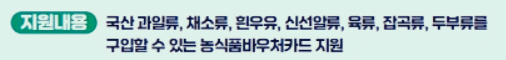 국산 과일류, 채소류, 흰우유, 신선알류, 육류, 잡곡류, 두부류를 구입할 수 있는 농식품 바우처